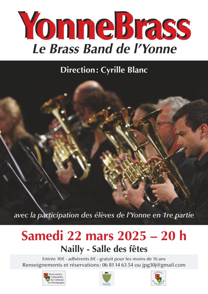 L’association Rencontres Culturelles du Gâtinais en Bourgogne vous invite à un concert exceptionnel du Brass Band de l’Yonne, dirigé par Cyrille Blanc, le samedi 22 mars 2025 à 20h, à la salle des fêtes de Nailly.