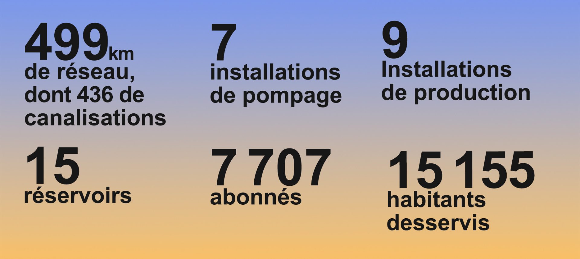 Prélevée en milieu naturel (nappes phréatiques, sources, etc.), l’eau passe par différents niveaux de traitement avant d’arriver au robinet. Cette phase de purification comporte de nombreuses étapes. Une fois traitée, l’eau est distribuée sur l’ensemble du territoire, à travers un réseau de canalisation de 436 km linéaires.