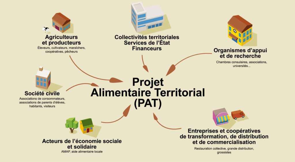 Dans un premier temps, le PAT a pour objectif d’établir un diagnostic et d’identifier les ressources et les besoins alimentaires du territoire, puis à mettre en place un plan d’action visant à promouvoir et renforcer les filières alimentaires et l’agriculture locale. Le PAT implique l’ensemble des acteurs locaux concernés par la question de l’alimentation :